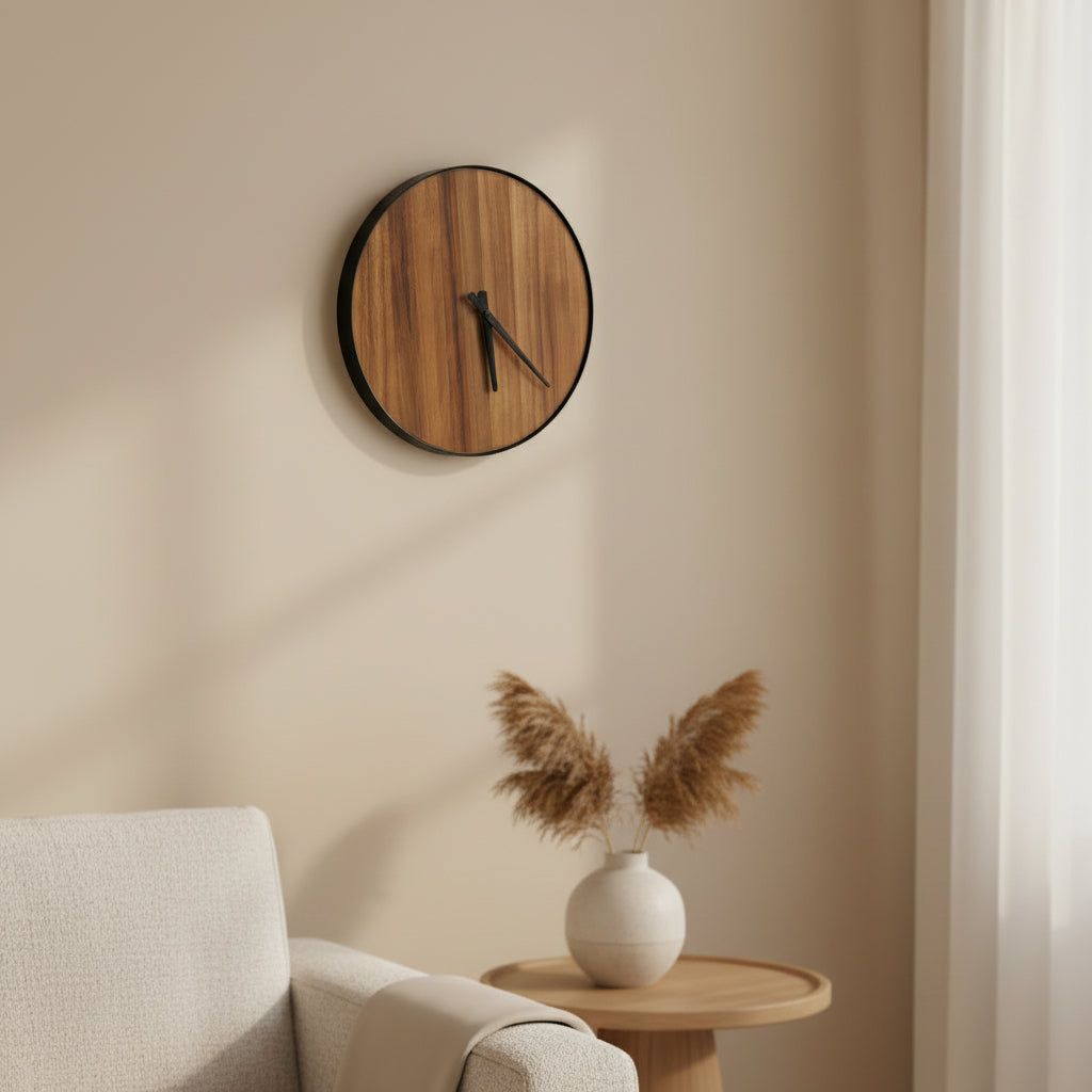 Este elegante reloj está hecho de madera y metal, un elemento perfecto para añadir un toque minimalista a cualquier espacio. Un accesorio de pared.  Con un diseño moderno y sofisticado, este reloj no solo es funcional, sino también un elemento decorativo único que combina estilo.