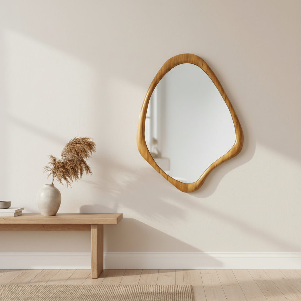 Este espejo decorativo con marco de madera y forma orgánica es perfecto para darle un toque elegante a cualquier habitación. Su diseño único y moderno lo convierte en una pieza de arte funcional. Además, su marco de madera añade un toque natural y cálido a cualquier espacio. ¡Haz que tu hogar se destaque con este hermoso espejo!