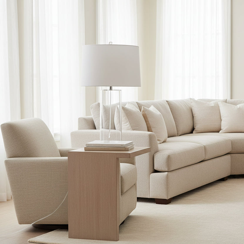 Elegante lámpara de mesa hecha de cristal, perfecta para añadir un toque sofisticado y tranquilizador a cualquier espacio. Esta iluminaria es totalmente funcional gracias a sus suaves tonos y materiales de calidad.