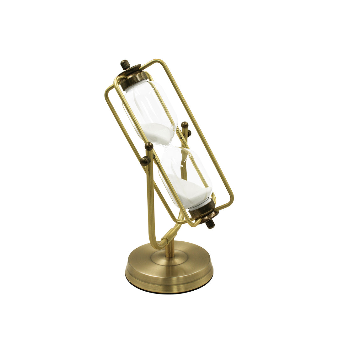 Esté reloj decorativo giratorio, diseñado con una estructura de metal y vidrio, cuenta con una arena blanca que gira suavemente dentro del reloj, agregando un toque de elegancia a cualquier espacio.