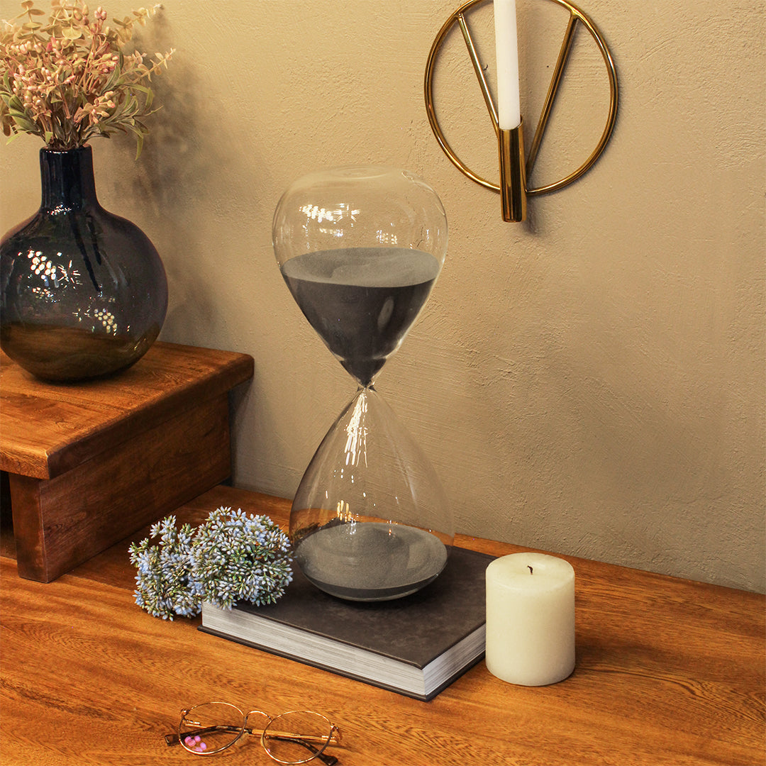 Este hermoso reloj decorativo fabricado en vidrio con una característica arena plata es la adición perfecta para cualquier hogar u oficina. Con su diseño único de formas orgánicas lo hacen una pieza decorativa impresionante, ademas de funcional. ¡Haz que tu espacio sea más elegante con este reloj decorativo!