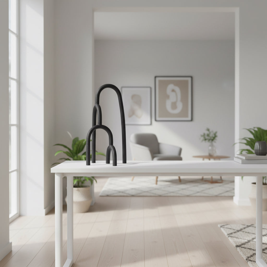 En acabado negro, con un diseño característico para generar una composición dinámica y elegante. Su estructura geométrica aporta profundidad y movimiento, convirtiéndola en un acento perfecto para espacios modernos, minimalistas o industriales. Ideal para exhibir en mesas de centro, estanterías o escritorios