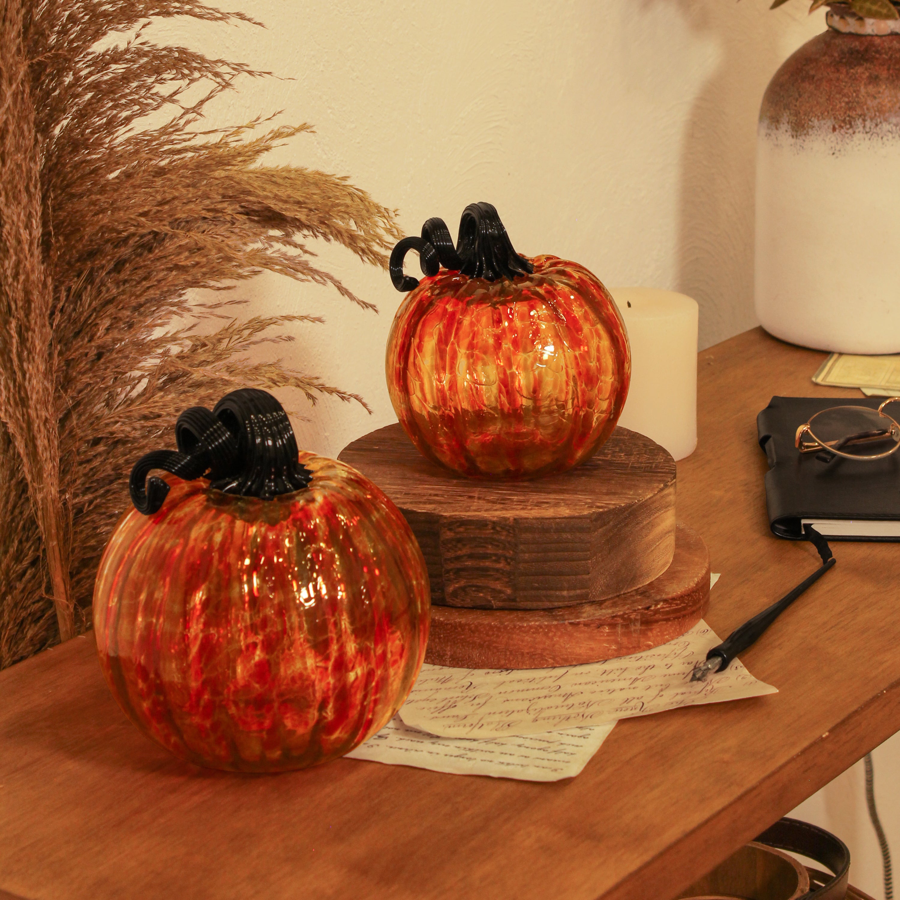 Eleva el encanto de tu decoración con esta pieza artesanal única, elaborada mediante la técnica tradicional de vidrio soplado. Cada calabaza presenta un diseño exclusivo, con tonos vibrantes y acabados brillantes que capturan la luz de manera cautivadora. Perfecta para dar un toque sofisticado y festivo a tu hogar en cualquier temporada, especialmente en otoño y Halloween. Ideal para lucir en mesas, repisas o centros de mesa, aportando calidez, estilo y un toque artístico inigualable.