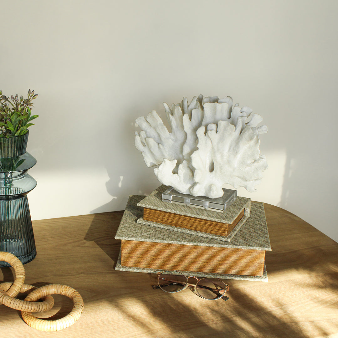 Escultura de coral decorativo en resina con base de acrílico, diseño elegante y único que captura la belleza marina. Pieza de arte nautico perfecta para decorar espacios sofisticados, salas de estar o ambientes costeros. Su acabado en resina de alta calidad y base acrílica transparente crean un efecto visual cautivador que refleja luz naturalmente. Medidas: 29 x 13.2 x 21 cm, ideal para coleccionistas y amantes de la decoración con estilo. Transforma cualquier rincón en un espacio con carácter y elegancia marina.
