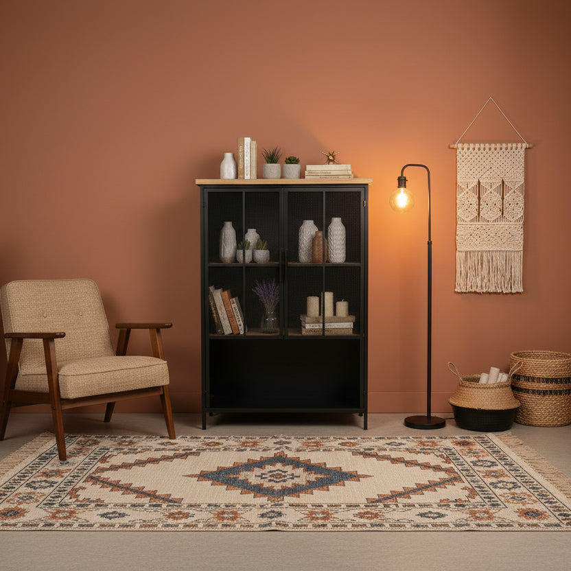 Este gabinete decorativo combina elegancia y funcionalidad en un diseño de madera y metal inspirado en el estilo industrial. Perfecto para añadir un toque de sofisticación.