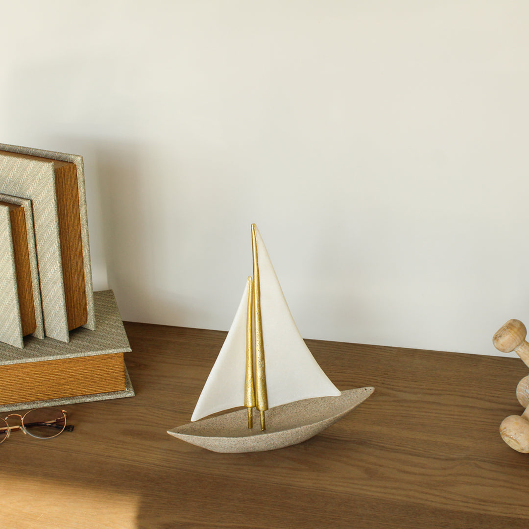 Velero decorativo que combina elegancia náutica con sofisticación moderna. Elaborado en resina y cuarzo, esta pieza captura la esencia del mar con un acabado y detalles acogedores. La hacen perfecta para destacar en estantes, mesas de centro o espacios que busquen un toque costero.